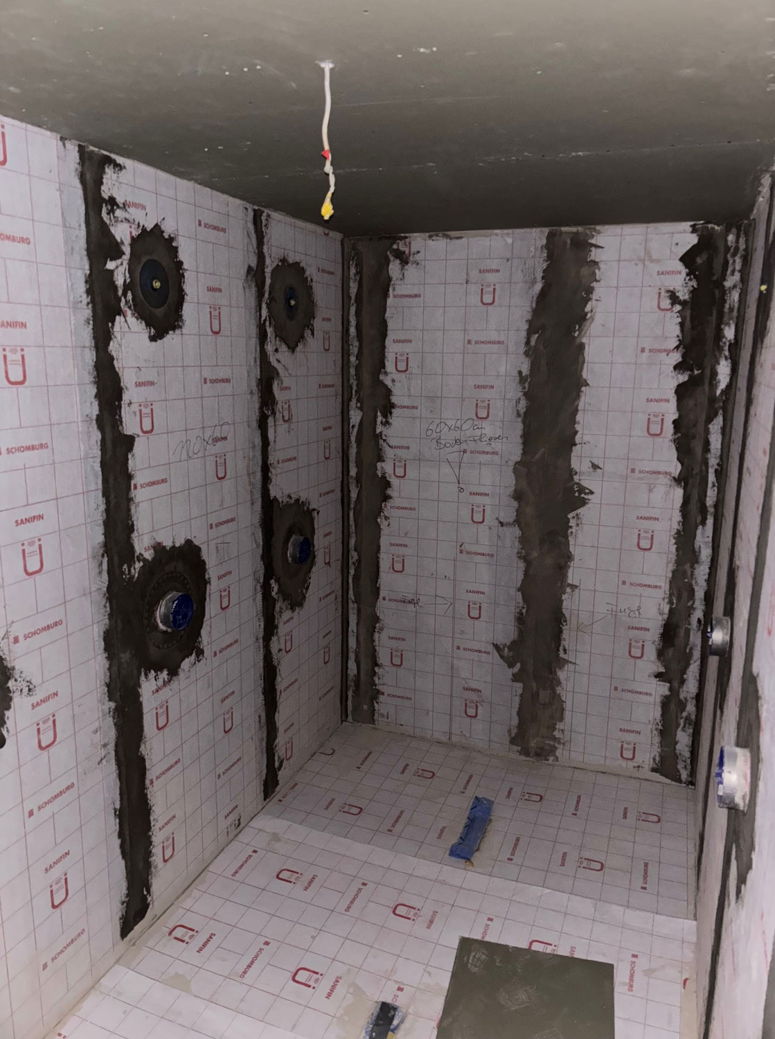 Die Renovierung der Duschen, Kabinen und den Fluren schreitet voran. Nach den Installationsarbeiten der Firma Habitzreither legt nun der Fliesenleger los.